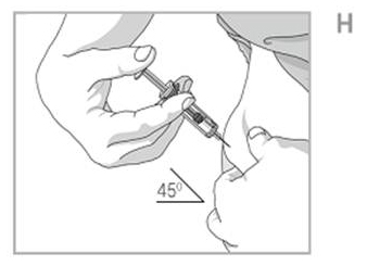 - Using a quick, dart- like motion, insert the needle into the squeezed skin at an angle of about 45degrees. See Figure H.
